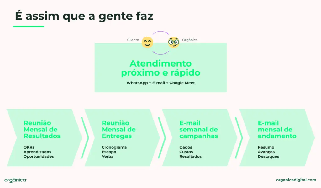 É aí que a Orgânica entra em campo. Com um método próprio, testado e validado, a gente transforma tráfego em resultado — daquele que impacta o negócio.